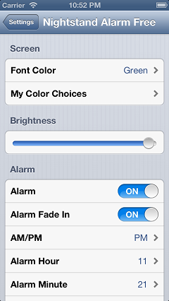- All of the settings are available in the standard Settings application (gray gears). Scroll down to the alphabetized list of apps near the bottom and look for Nightstand Alarm Free.