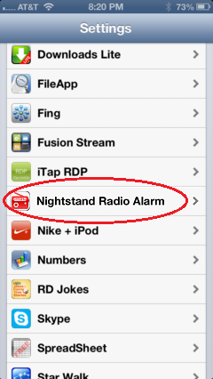 - All of the settings are available in the standard Settings application (gray gears). Scroll down to the alphabetized list of apps near the bottom and look for Nightstand Alarm.